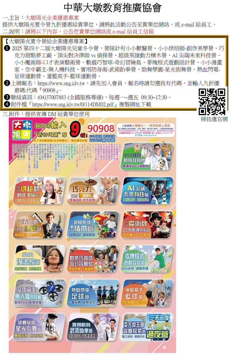 大墩陽光夏令營優惠專案 活動日期 114/06/05 00:00 - 114/06/30 00:00 活動地點 [國內] 大墩陽光冬夏令營 主講人 主辦單位 大墩陽光冬夏令營 負責人 協辦單位 活動內容 轉知中華大墩教育推廣協會來訊"大墩陽光夏令營" 九折優惠活動 聯絡資訊 聯絡人 賴小姐 聯絡電話 (02)2396-5392#203 傳真 電子信箱 課程明細 課程時間(起) 課程時間(迄) 課程名稱 課程地點 人數限制 大墩陽光夏令營優惠專案 分享: twitter facebook LINE 返回 活動清單
