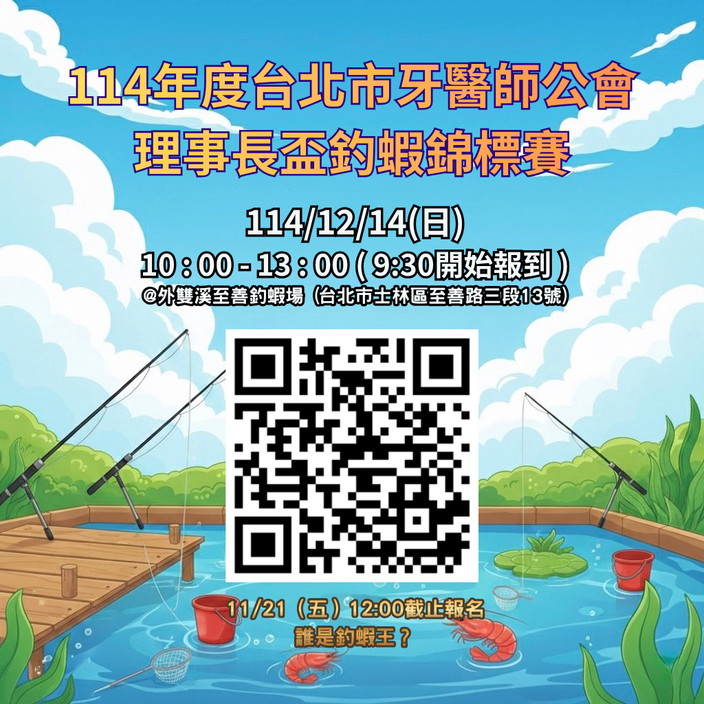 114年度台北市牙醫師公會理事長盃釣蝦錦標賽 報名截止日期:114/11/21(五)中午12時,或額滿為止。洽詢專線:02-2396-5392分機214 賴小姐 大家期待已久的釣蝦錦標賽來囉!無論你是釣蝦老手還是新手好手, 快來展現你的技術與運氣,一起爭奪「釣蝦王」的榮耀吧!