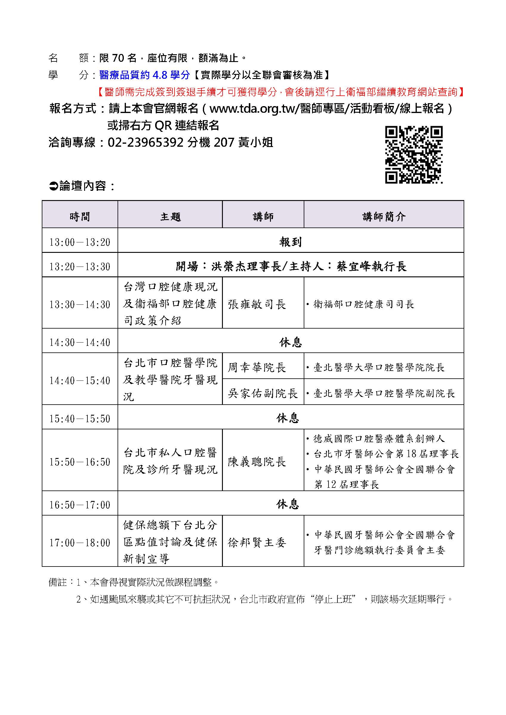 | 115/01/03 13:30 | 115/01/03 18:00 | 台北市牙科醫療現況論壇 | 中華民國牙醫師公會全國聯合會 第一會議室 |
