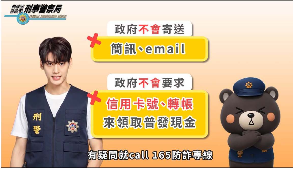 全民普發現金,政府不會發簡訊或電子郵件要求登錄、更不會要求操作ATM,不點擊、不填輸、不匯款、不轉傳。