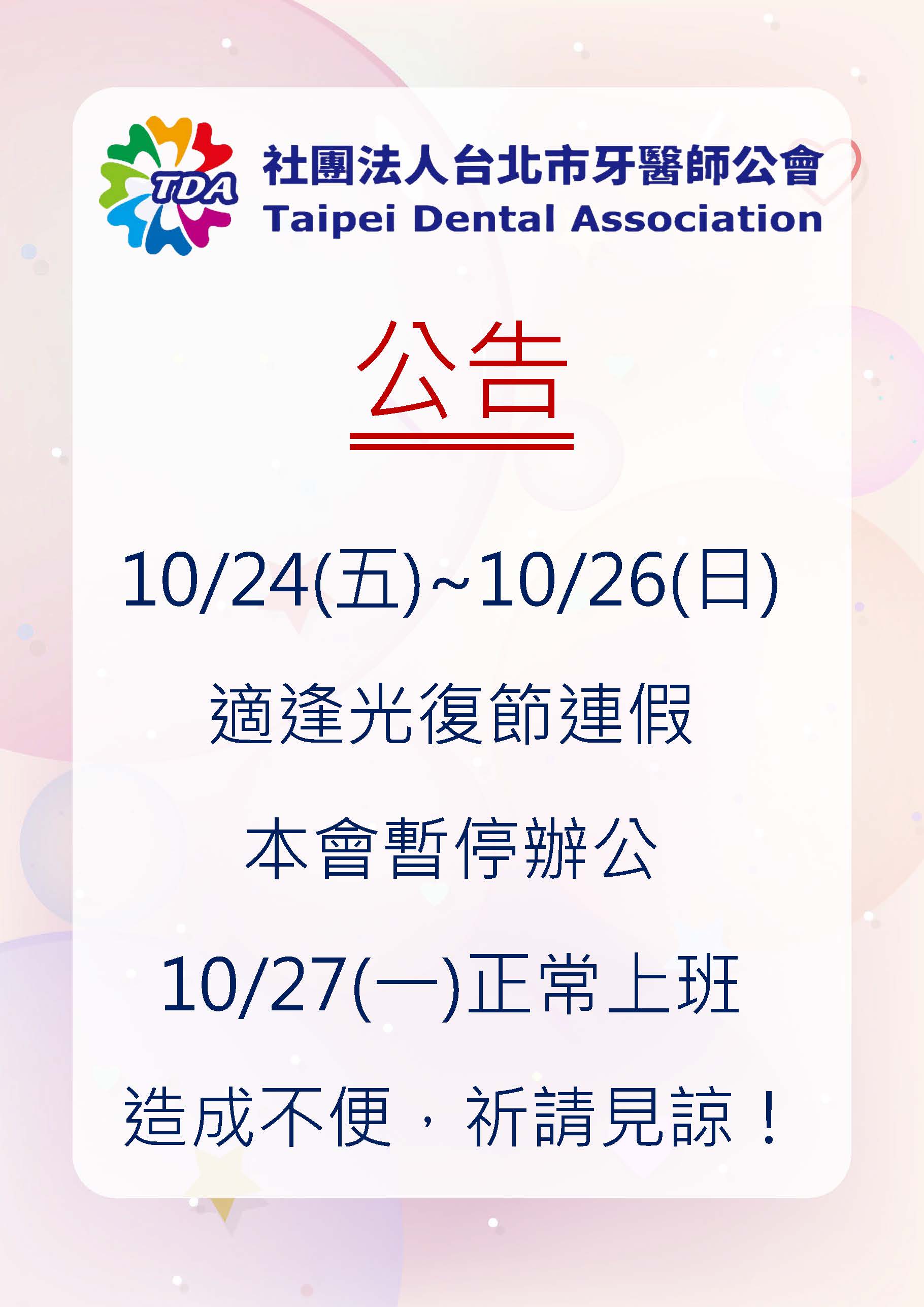 本會10/24(五)~10/26(日)光復節連假暫停辦公,10/27(一)正常上班