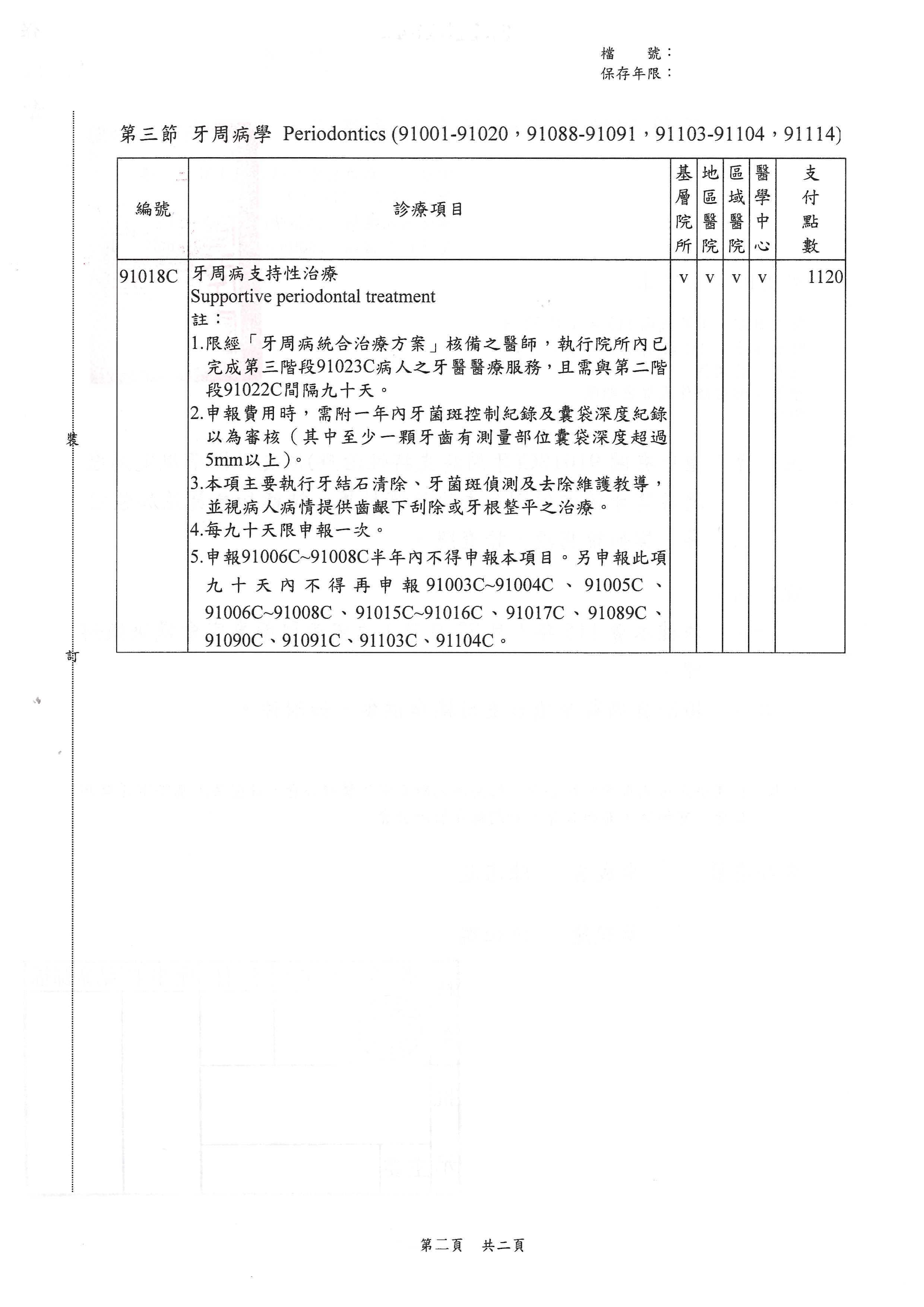 主旨:重申有關91018C(牙周病支持性治療)依支付標準規定病歷應書寫牙菌斑偵測及去除維護教導,請轉知會員並加強宣導,詳如說明段,請查照。