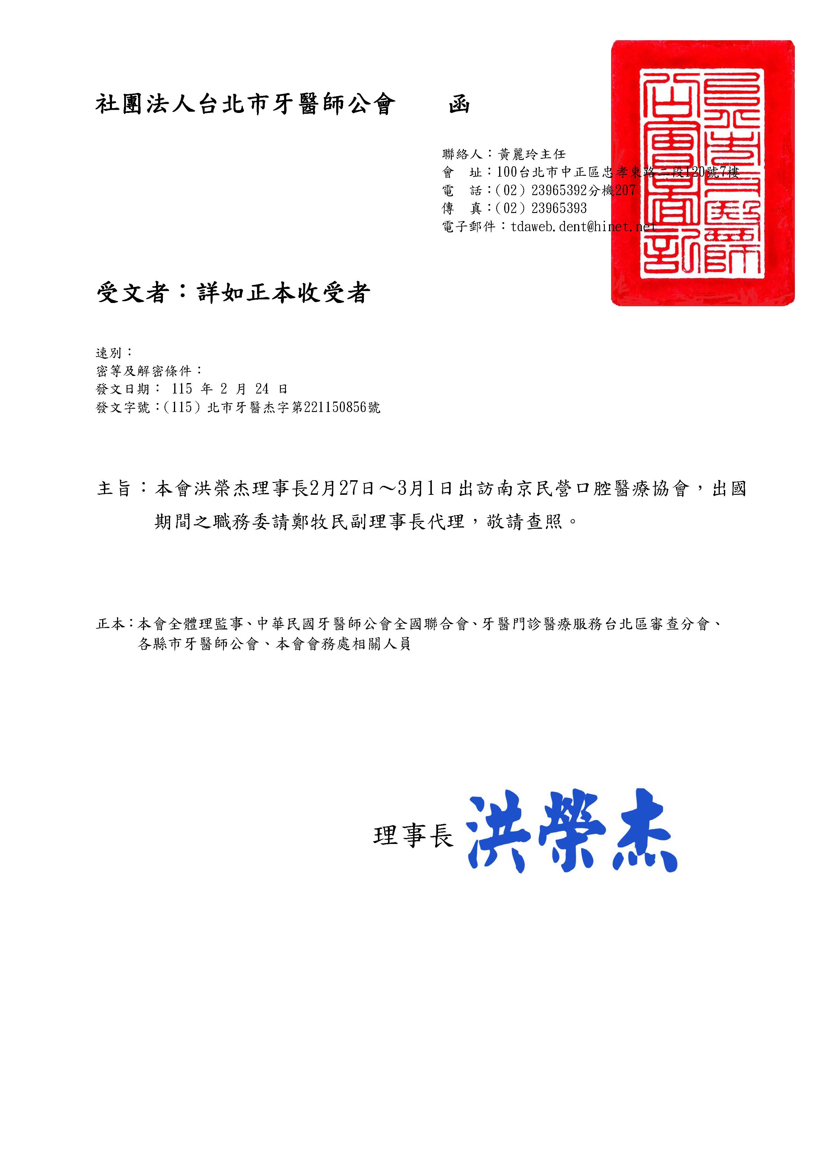 會務公告 本會洪榮杰理事長2月27日~3月1日出訪南京民營口腔醫療協會,出國期間之職務委請鄭牧民副理事長代理。 發佈日期:115.02.25 分享: twitter facebook LINE 返回 訊息清單