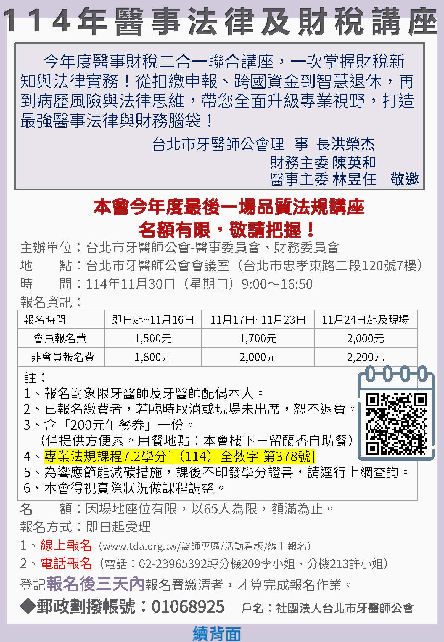 | 114/11/30 09:00 | 114/11/30 17:00 | 114年醫事法律及財稅講座 | 台北市牙醫師公會(台北市忠孝東路二段120號7樓) | 0/65 |