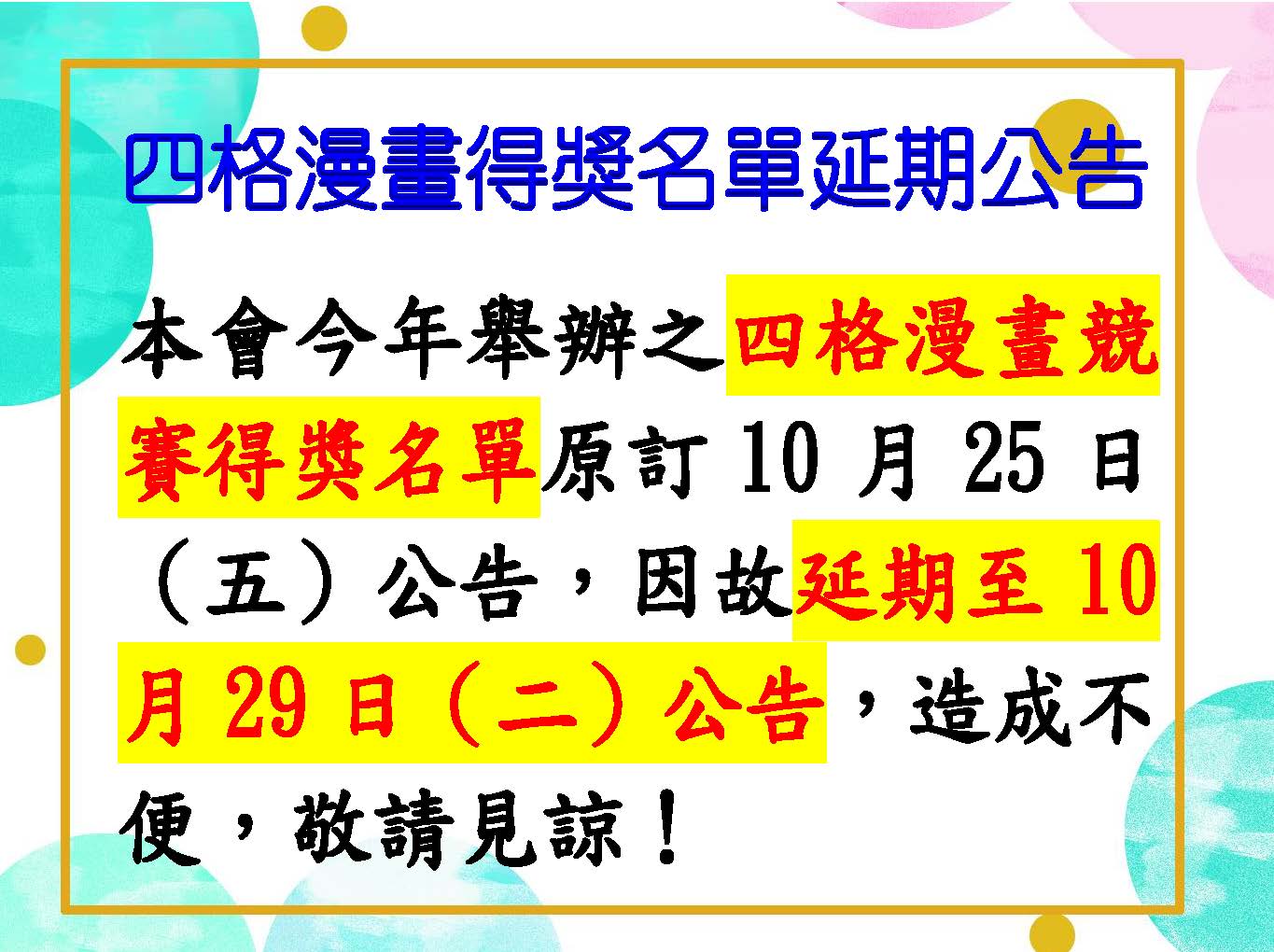 四格漫畫得獎名單延期公告 活動日期 113/10/25 09:00 - 113/10/29 09:00 活動地點 [國內] 本會七樓演講廳 主講人 主辦單位 台北市牙醫師公會 負責人 協辦單位 活動內容 聯絡資訊 聯絡人 聯絡電話 傳真 電子信箱 分享: twitter facebook LINE 返回 活動清單