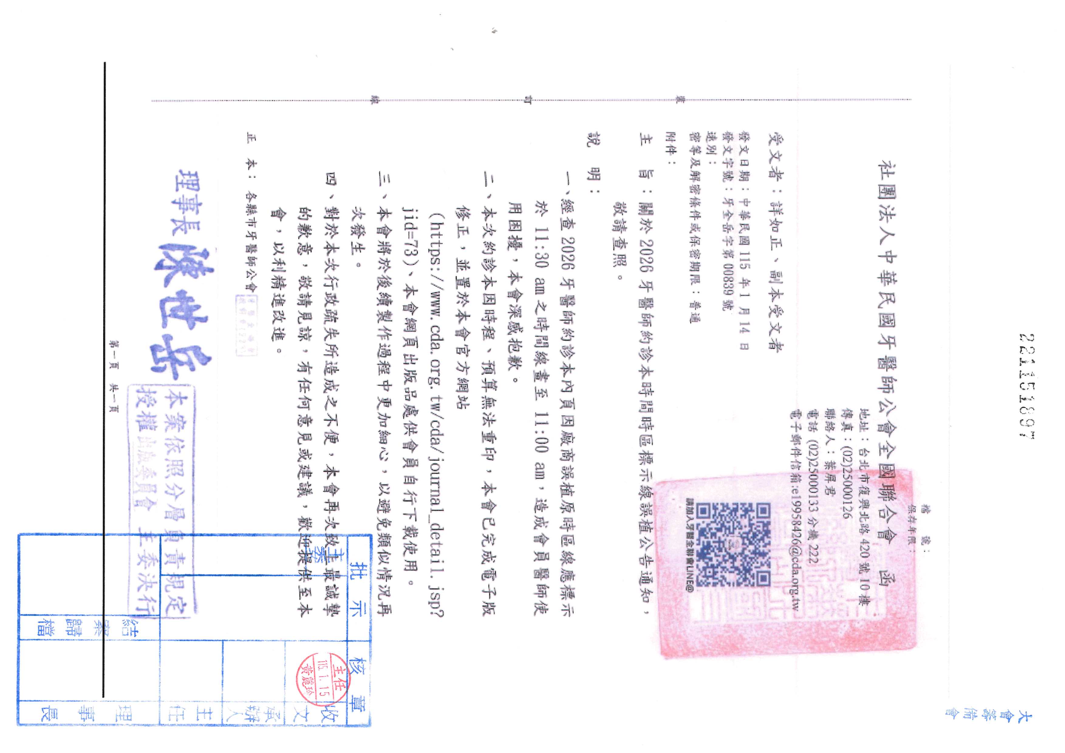 會務公告 有關2026牙醫師約診本時間時區標示線誤植公告通知 發佈日期:115.01.19 有關2026牙醫師約診本時間時區標示線誤植,全聯會已完成電子版修正, 並置於全聯會官方網站,會員請自行下載使用 https://www.cda.org.tw/cda/journal_detail.jsp?jid=73 分享: twitter facebook LINE 返回 訊息清單